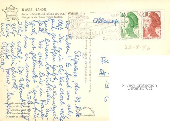 13152543 carte postale Landes Carte routiere Recta Foldex Sud Ouest Pyrenees Routier Landois postalisch gelaufen Erhaltung siehe scans [FriedD77] KatCode: 11170017517202