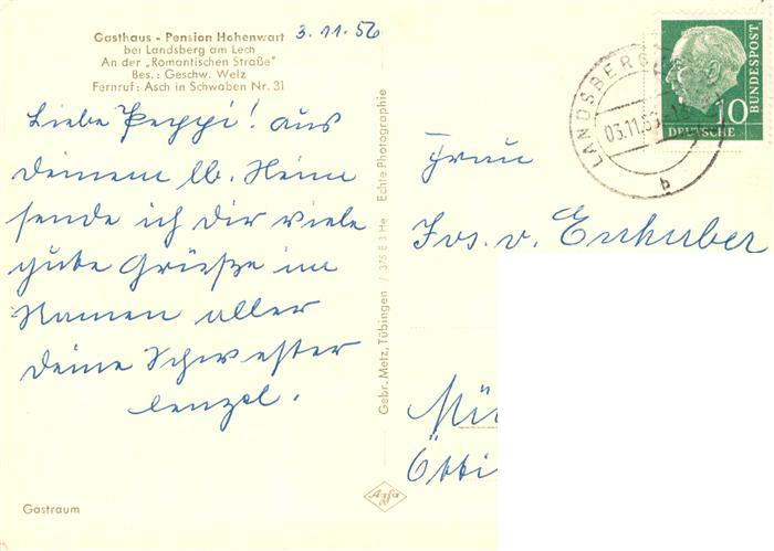 73898308 alte Postkarte Landsberg Lech Bayern Gasthaus Pension Hohenwart postalisch gelaufen Erhaltung siehe scans [WerneD78] KatCode: 11110009181130