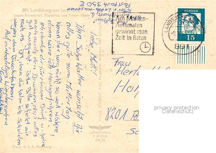 73165655 alte Postkarte Landsberg Lech Fliegeraufnahme mit Karwendel Zugspitze und Tiroler Alpen postalisch gelaufen Erhaltung siehe scans [WerneD78] KatCode: 11110009181130