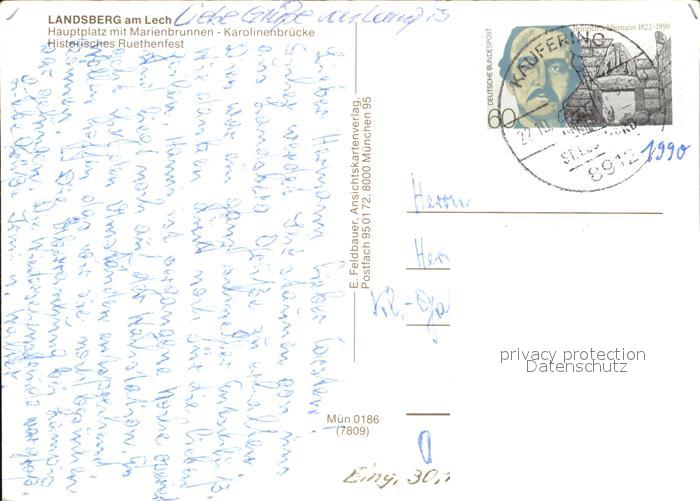 72522699 alte Postkarte Landsberg Lech Hauptplatz mit Marienbrunnen Karolinenbruecke Historisches Ruethenfest postalisch gelaufen Erhaltung siehe scans KatCode: 11110009181130