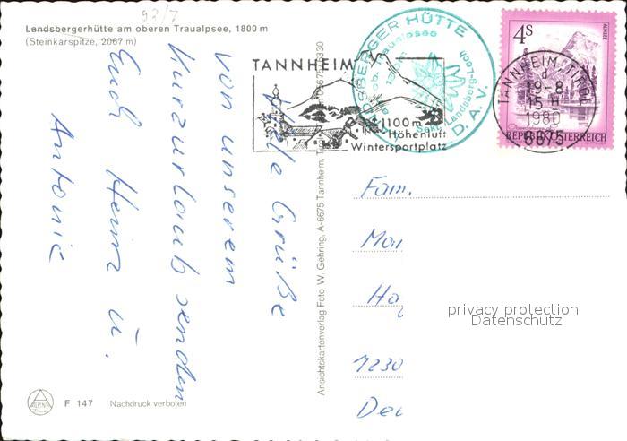 72490505 alte Postkarte Landsbergerhuette am Traualpsee mit Steinkarspitze postalisch gelaufen Erhaltung siehe scans KatCode: 11390331070832
