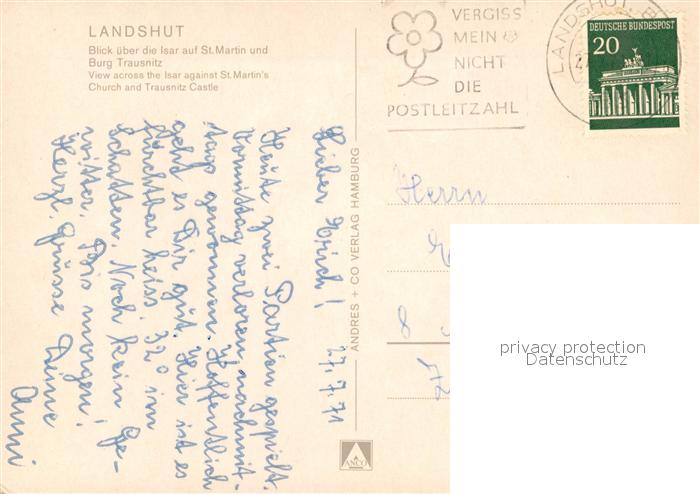 73148413 alte Postkarte Landshut Isar Blick ueber die Isar auf St Martin Kirche Burg Trausnitz postalisch gelaufen Erhaltung siehe scans [FriedD77] KatCode: 11110009261000