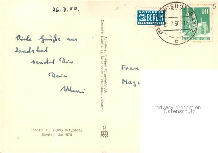 73738809 alte Postkarte Landshut Isar Burg Trausnitz Burghof postalisch gelaufen Erhaltung siehe scans [FriedD77] KatCode: 11110009261000