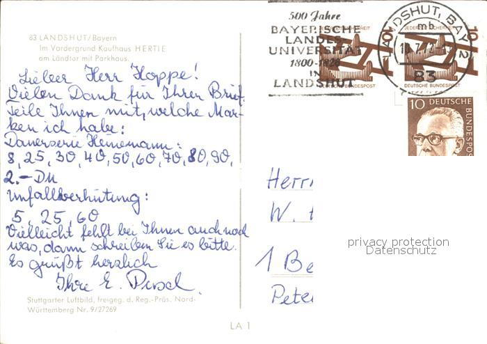 72285993 alte Postkarte Landshut Isar Kaufhaus Hertie Laendtor Parkhaus Kirche Schloss Fliegeraufnahme postalisch gelaufen Erhaltung siehe scans KatCode: 11110009261000