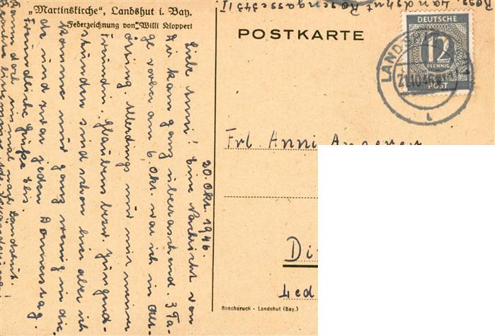 73901344 alte Postkarte Landshut Isar Martinskirche Federzeichnung postalisch gelaufen Erhaltung siehe scans [WerneD78] KatCode: 11110009261000
