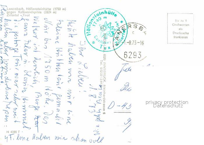 72884179 alte Postkarte Lanersbach Hoellensteinhuette mit Kalkwandspitze postalisch gelaufen Erhaltung siehe scans [WerneD78] KatCode: 11390335070908