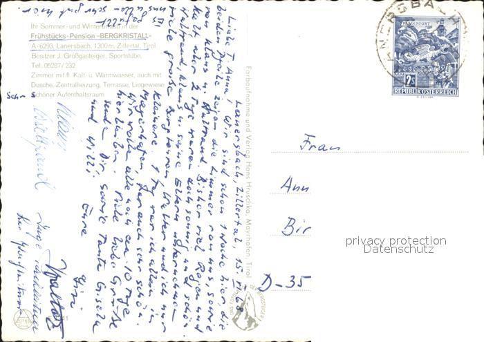72486318 alte Postkarte Lanersbach Pension Bergkristall postalisch gelaufen Erhaltung siehe scans KatCode: 11390335070908