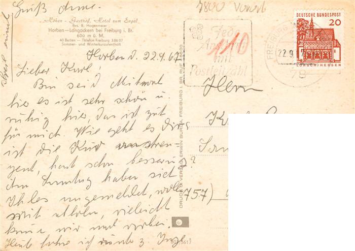 73932770 alte Postkarte Langackern Horben Hoehen Gasthof Hotel zum Engel postalisch gelaufen Erhaltung siehe scans [WerneD78] KatCode: 11110008315056