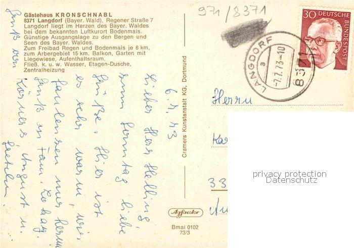 72796635 alte Postkarte Langdorf Regen Gaestehaus Kronschnabl Freibad Regen Arber postalisch gelaufen Erhaltung siehe scans [KathaD81] KatCode: 11110009276129