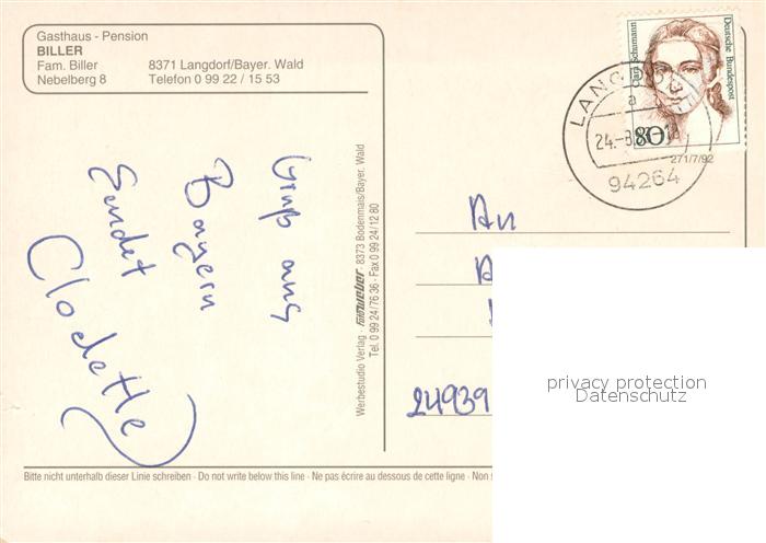 73651736 alte Postkarte Langdorf Regen Gasthaus Pension Biller Gastraeume Kapelle postalisch gelaufen Erhaltung siehe scans [WerneD78] KatCode: 11110009276129