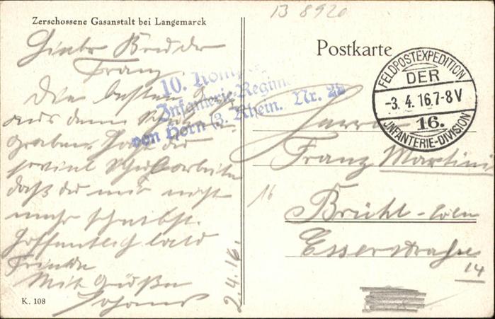 41031272 Langemarck zerschossene Gasanstalt postalisch gelaufen Alte Ansichtskarte Postkarte carte postale Ulri Katcode 11070033002082