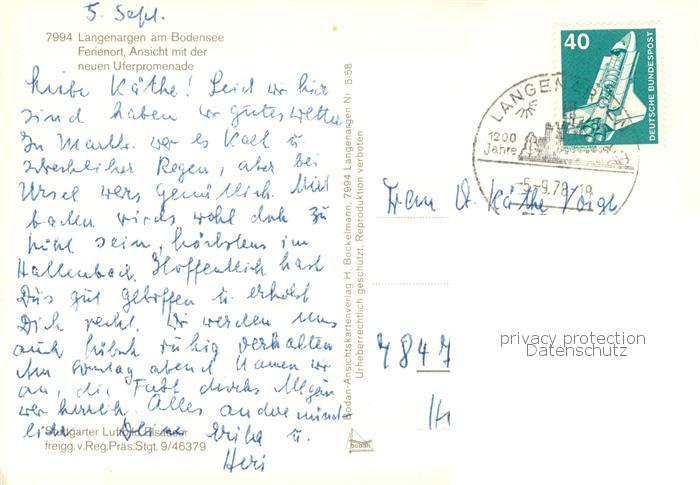 73755536 alte Postkarte Langenargen Bodensee Ansicht mit neuer Uferpromenade postalisch gelaufen Fliegeraufnahme Erhaltung siehe scans [FriedD77] KatCode: 11110008435030