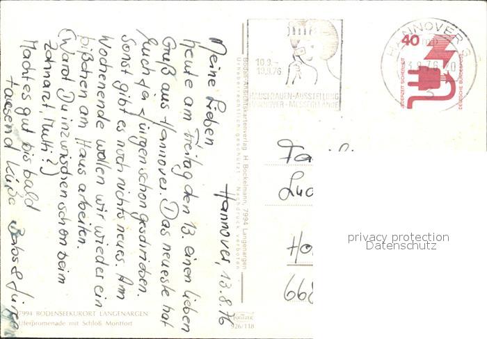 72142844 alte Postkarte Langenargen Bodensee Promenade mit Schloss Monfort postalisch gelaufen Erhaltung siehe scans KatCode: 11110008435030