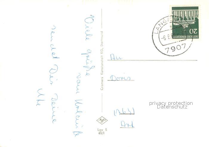 73644530 alte Postkarte Langenau Wuerttemberg Kirche Innenansicht Freibad Rathaus Fliegeraufnahme postalisch gelaufen Erhaltung siehe scans [FriedD77] KatCode: 11110008425072