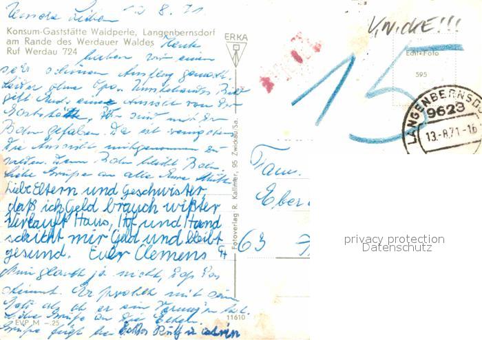 72635978 alte Postkarte Langenbernsdorf Konsum Gaststaette Waldperle am Werdauer Wald Flugzeug postalisch gelaufen Erhaltung siehe scans [FriedD77] KatCode: 11110014193190
