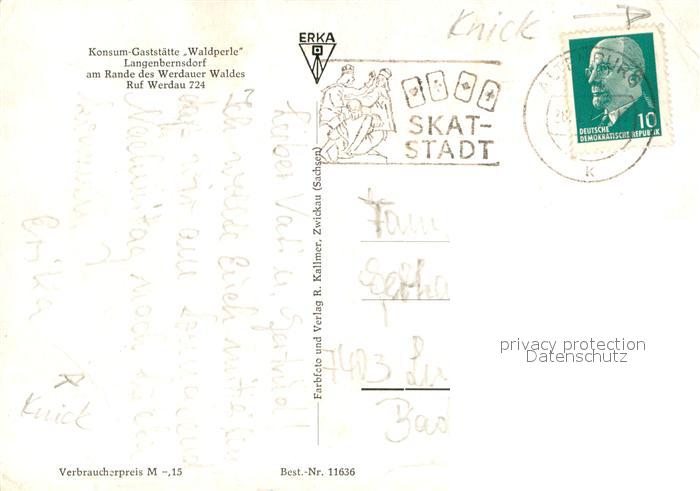 73741990 alte Postkarte Langenbernsdorf Konsum Gaststaette Waldperle postalisch gelaufen Erhaltung siehe scans [FriedD77] KatCode: 11110014193190
