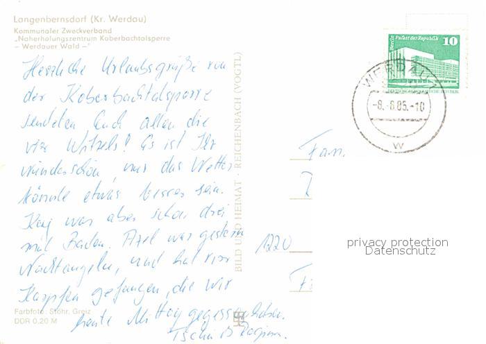 72849270 alte Postkarte Langenbernsdorf Naherholungszentrum Koberbachtalsperre Werdauer Wald postalisch gelaufen Erhaltung siehe scans [KathaD81] KatCode: 11110014193190