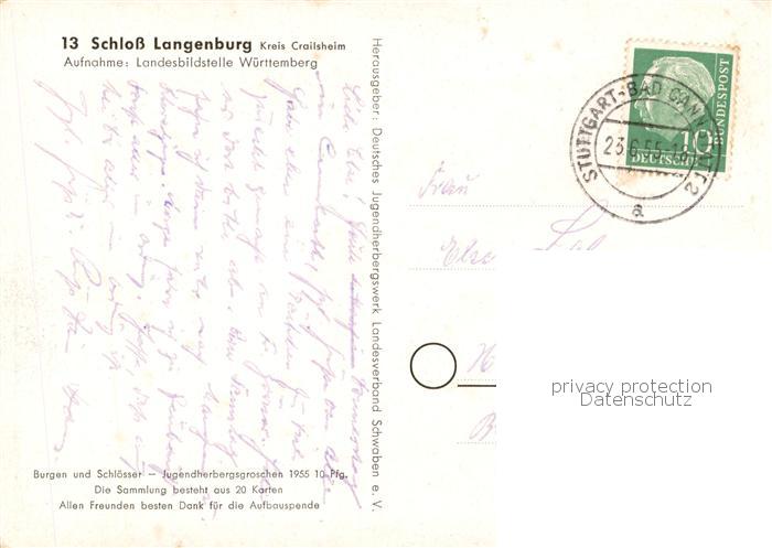 73788723 alte Postkarte Langenburg Wuerttemberg Schloss Sammlung Burgen und Schloesser Jugendherbergsgroschen 1955 Karte Nr. 13 postalisch gelaufen Erhaltung siehe scans [FriedD77] KatCode: 11110008127047