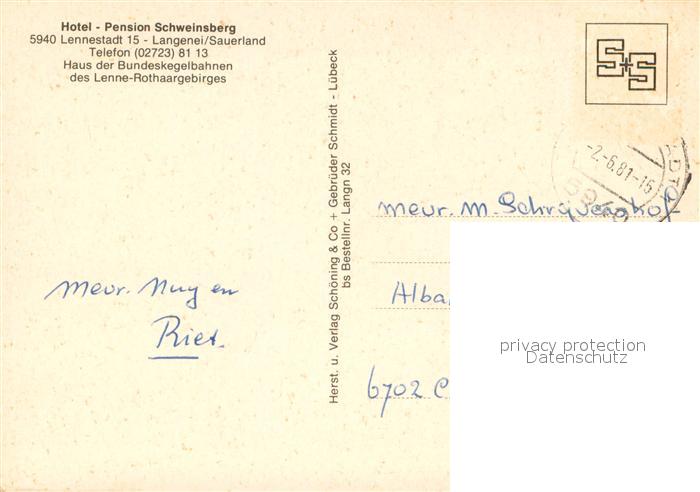 73666770 alte Postkarte Langenei Hotel Pension Schweinsberg Gastraeume Bundeskegelbahn postalisch gelaufen Erhaltung siehe scans [WerneD78] KatCode: 11110005966020