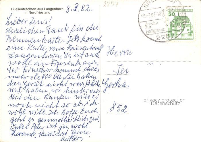 72311333 alte Postkarte Langenhorn Husum Reetdachhaus und Frauen in Tracht postalisch gelaufen Erhaltung siehe scans KatCode: 11110001054075