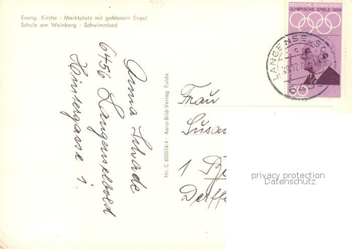 73125482 alte Postkarte Langenselbold Kirche Marktplatz mit goldenem Engel Schule am Weinberg Schwimmbad Freibad postalisch gelaufen Erhaltung siehe scans [FriedD77] KatCode: 11110006435017