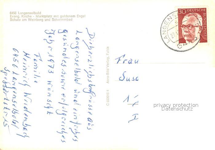 73125502 alte Postkarte Langenselbold Kirche Marktplatz mit goldenem Engel Schule am Weinberg Schwimmbad Freibad postalisch gelaufen Erhaltung siehe scans [FriedD77] KatCode: 11110006435017