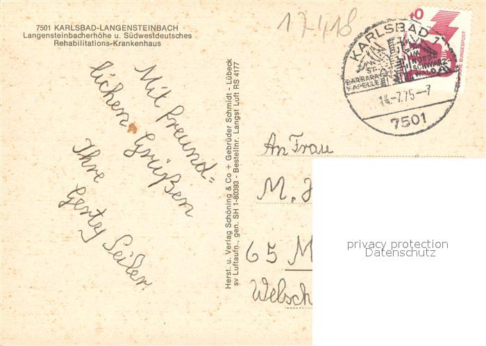 73636469 alte Postkarte Langensteinbach Karlsbad Langensteinbacherhoehe Reha-Krankenhaus Fliegeraufnahme postalisch gelaufen Erhaltung siehe scans [FriedD77] KatCode: 11110008215096