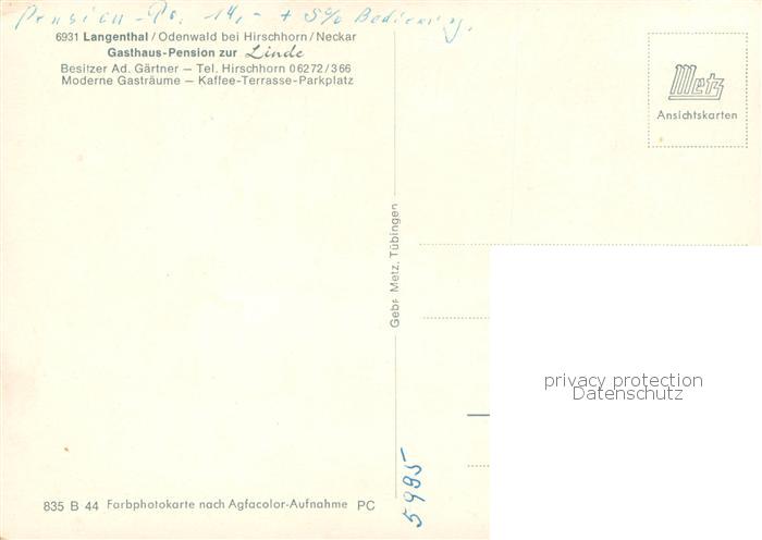 73833880 Langenthal Odenwald Gasthaus Pension zur Linde postalisch nicht gelaufen Erhaltung siehe scans [FriedD77] KatCode: 11110006431012
