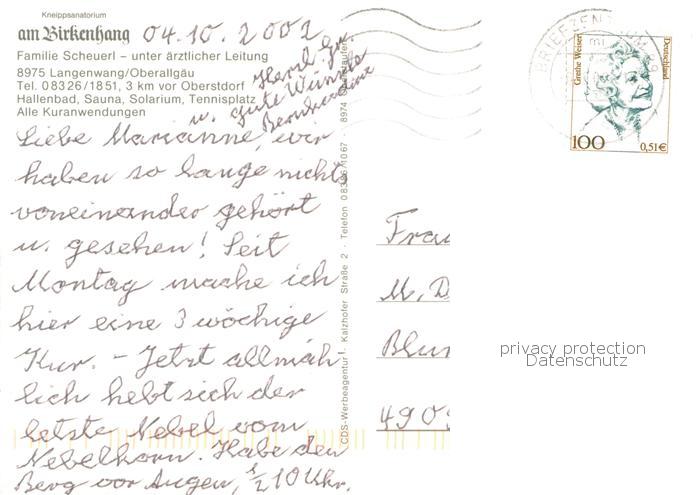 73779130 alte Postkarte Langenwang Fischen Kneippsanatorium am Birkenhang postalisch gelaufen Erhaltung siehe scans [WerneD78] KatCode: 11110009780121