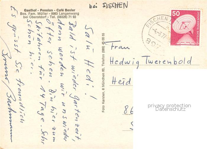 73651770 alte Postkarte Langenwang Fischen Panorama Gasthof Pension Cafe Besler Gastraeume Zimmer postalisch gelaufen Erhaltung siehe scans [WerneD78] KatCode: 11110009780121