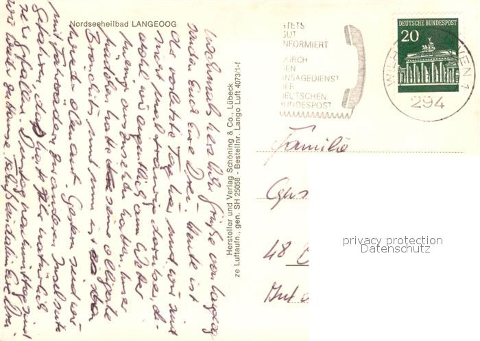 73111919 alte Postkarte Langeoog Nordseebad Fliegeraufnahme postalisch gelaufen Erhaltung siehe scans [NatalD47] KatCode: 11110003462007