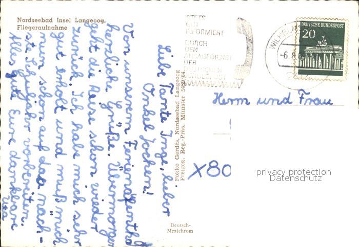 72370763 alte Postkarte Langeoog Nordseebad Fliegeraufnahme postalisch gelaufen Erhaltung siehe scans KatCode: 11110003462007