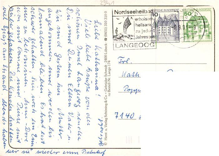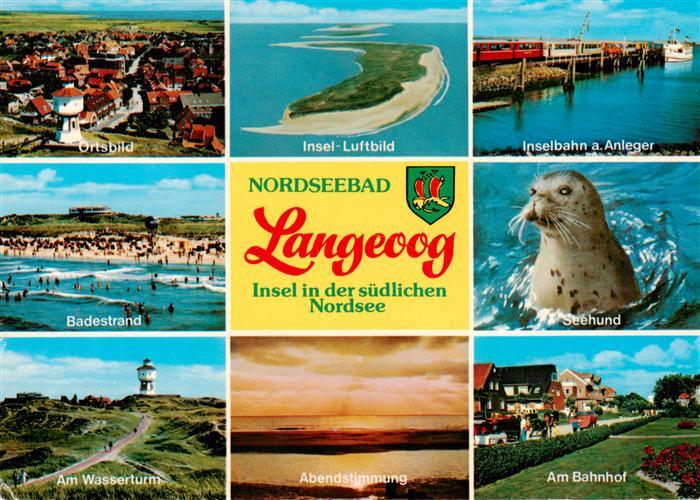 73937168 alte Postkarte Langeoog Nordseebad Fliegeraufnahmen Anleger Inselbahn Badestrand Wasserturm Abendstimmung Am Bahnhof postalisch gelaufen Erhaltung siehe scans [WerneD78] KatCode: 11110003462007