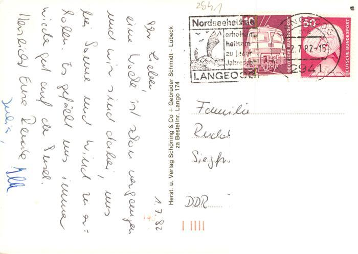 73937169 alte Postkarte Langeoog Nordseebad Fliegeraufnahmen Anleger Inselbahn Badestrand Wasserturm Abendstimmung Am Bahnhof postalisch gelaufen Erhaltung siehe scans [WerneD78] KatCode: 11110003462007