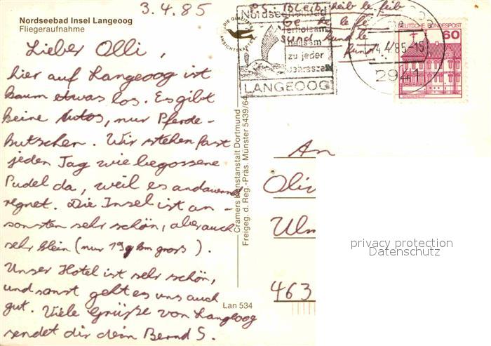 72743994 alte Postkarte Langeoog Nordseebad Nordseeinsel Fliegeraufnahme postalisch gelaufen Erhaltung siehe scans [FriedD77] KatCode: 11110003462007