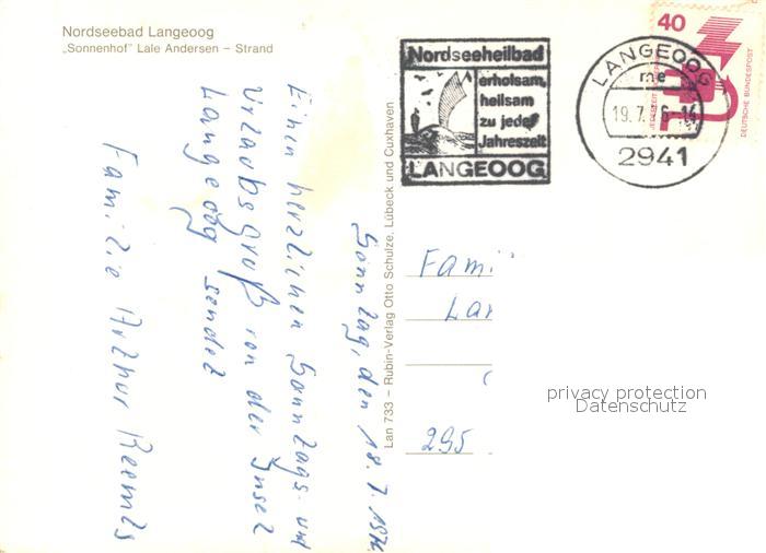 73042588 alte Postkarte Langeoog Nordseebad Sonnenhof Lale Andersen Strand Duenen postalisch gelaufen Erhaltung siehe scans [FriedD77] KatCode: 11110003462007