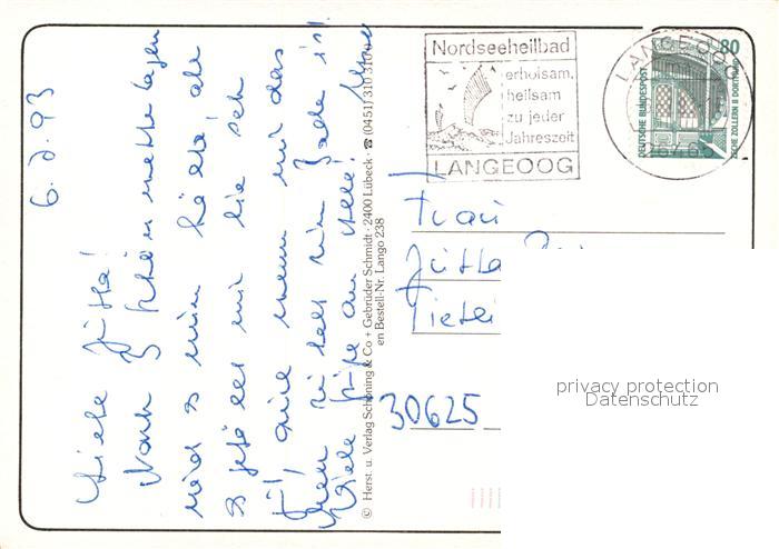 73294363 alte Postkarte Langeoog Nordseebad Strandhalle Abendstimmung Duenenlandschaft Kuranlage Wellenbad Dorfstrasse Flugplatz Inselbahn MS Langeoog Wasserturm postalisch gelaufen Erhaltung siehe scans [FriedD77] KatCode: 11110003462007