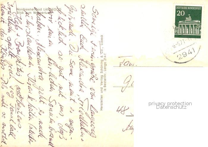 73111925 alte Postkarte Langeoog Nordseebad Wasserturm postalisch gelaufen Erhaltung siehe scans [NatalD47] KatCode: 11110003462007