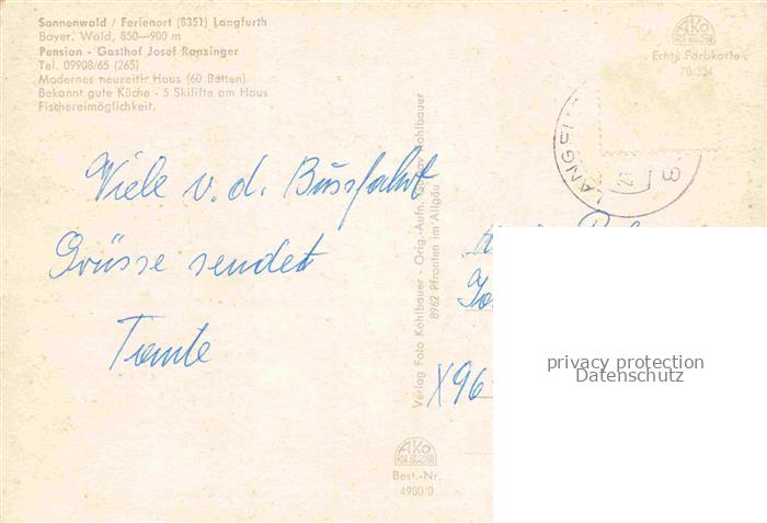 74096115 alte Postkarte Langfurth Schoefweg Bayerischer Wald Bayern Sonnenwald Pension Gasthof Ranzinger postalisch gelaufen Erhaltung siehe scans [WerneD78] KatCode: 11110009272145