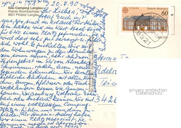 73629289 alte Postkarte Langlau See Camping Kleiner Brombachsee Fliegeraufnahme postalisch gelaufen Erhaltung siehe scans [FriedD77] KatCode: 11110009577159