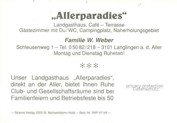 73339605 Langlingen Landgasthaus Allerparadies Cafe Bar Kanal Schleuse postalisch nicht gelaufen Werbekarte (keine Postkarte) Erhaltung siehe scans [FriedD77] KatCode: 11110003351017
