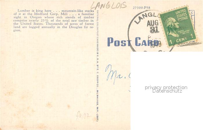 73709421 old postcard Langlois Oregon Major Industry Lumbering Air view postalisch gelaufen Erhaltung siehe scans [WerneD78] KatCode: 14140400000000