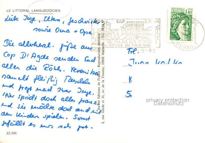 13843161 Languedoc-Roussillon Aigues Mortes Le Grau du Roi Palavas La Grande Motte Agde Valras Plage Marseillan Sete Frontignan postalisch gelaufen Erhaltung siehe scans [WerneD78] carte postale Wern Katcode 11170017417244