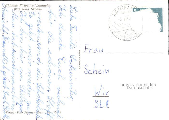 11626981 alte Postkarte Langwies GR Skihaus Pirigen Blick gegen Toedikette Alpenpanorama postalisch gelaufen Erhaltung siehe scans KatCode: 11470100345310