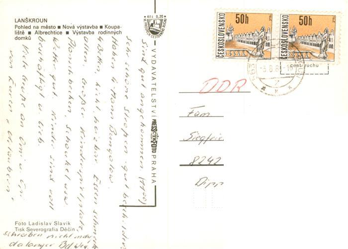 old postcard Lanskroun Landskron CZ Pohled na mesto Nova vystavby koupaliste Albrechtice Vystavba rodinnych domku postalisch gelaufen Erhaltung siehe scans [FriedD77]