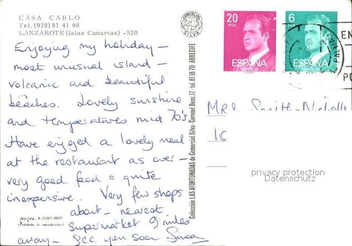 old postcard Lanzarote Kanarische Inseln Casa Carlo postalisch gelaufen Erhaltung siehe scans