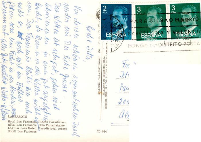 old postcard Lanzarote Kanarische Inseln ES Hotel Los Farones postalisch gelaufen Erhaltung siehe scans [WerneD78]