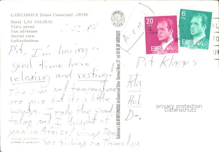 old postcard Lanzarote Kanarische Inseln Hotel Las Salinas %fa postalisch gelaufen Erhaltung siehe scans