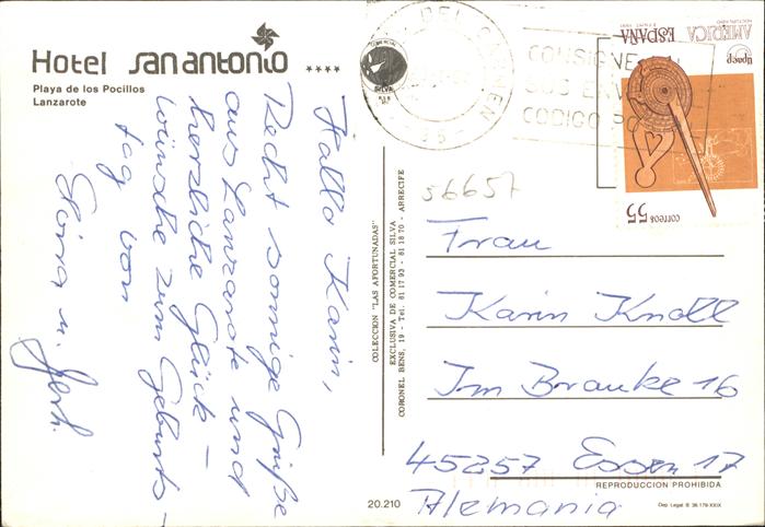 old postcard Lanzarote Kanarische Inseln Hotel San Antonio Playa de los Pocillos Strand Fliegeraufnahme postalisch gelaufen Erhaltung siehe scans