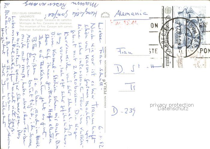 old postcard Lanzarote Kanarische Inseln Montana de Fuego Caravana de camellos Kamel Karawane Vulkangebiet postalisch gelaufen Erhaltung siehe scans
